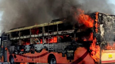 जैसलमेर में चलती निजी बस में भीषण आग, कई यात्री झुलसे।